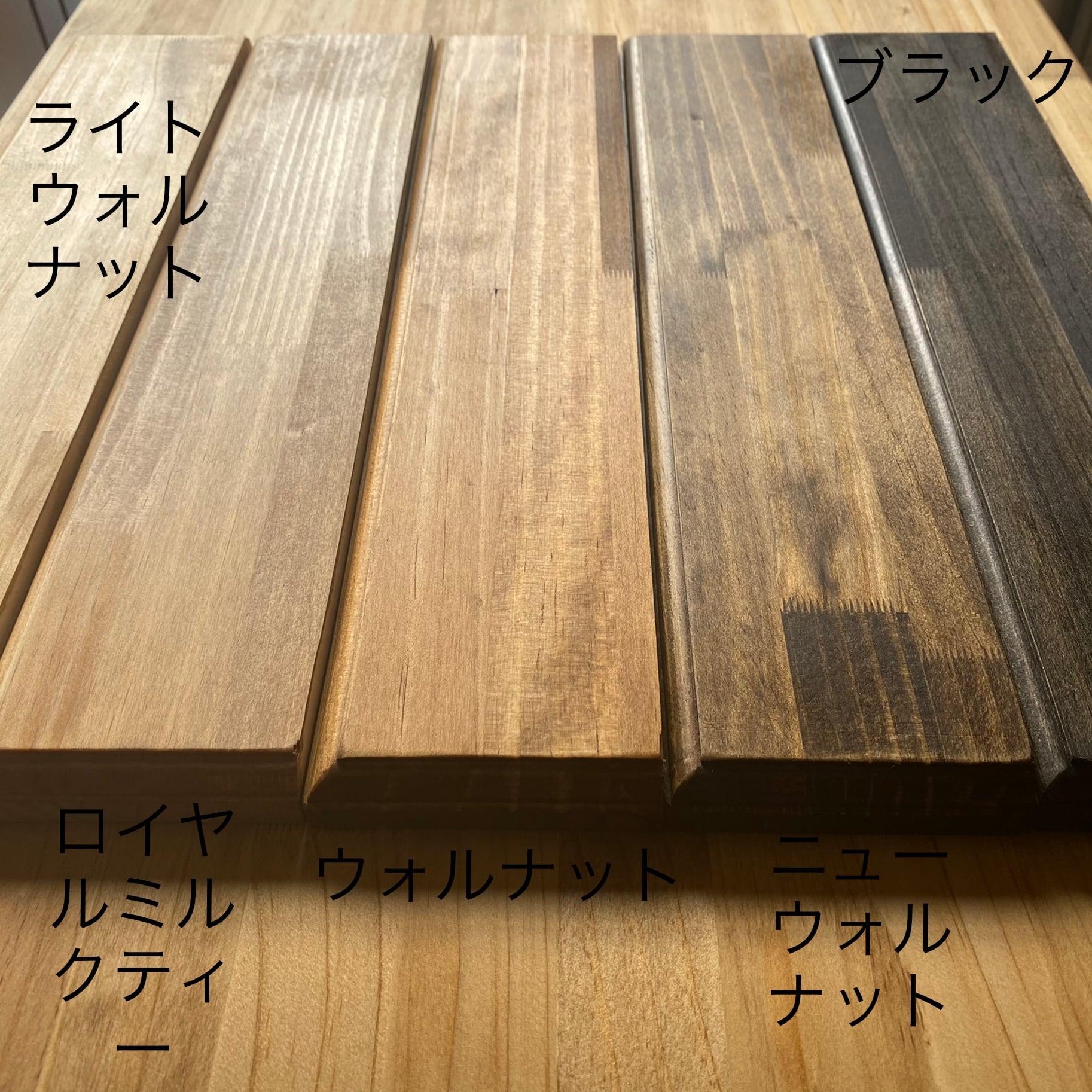 木材は自然の物なので、木の繊維は同じ物はないのでその時々でどうしても「板目の違い」や「薄い、濃い」が多少あります。