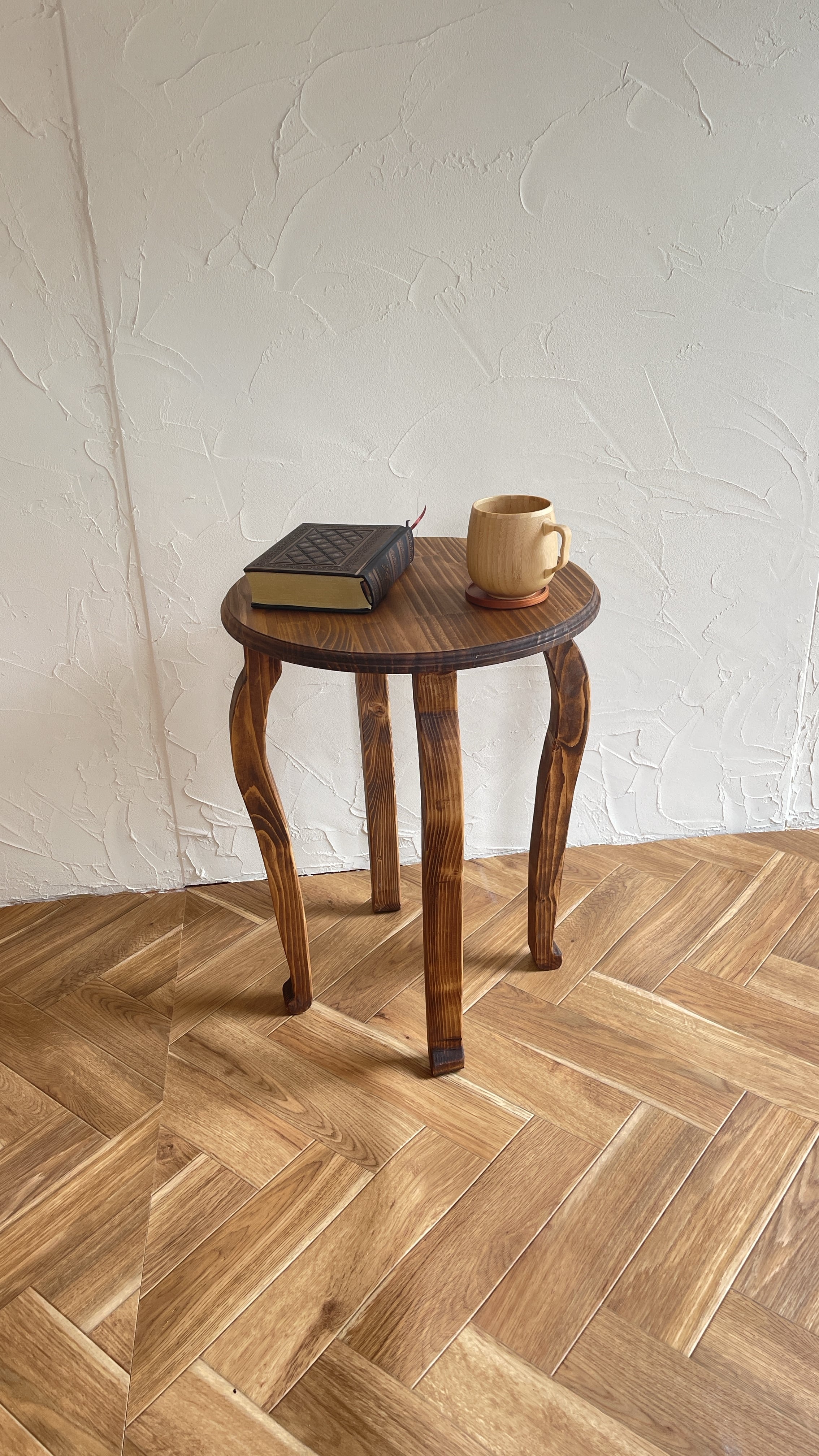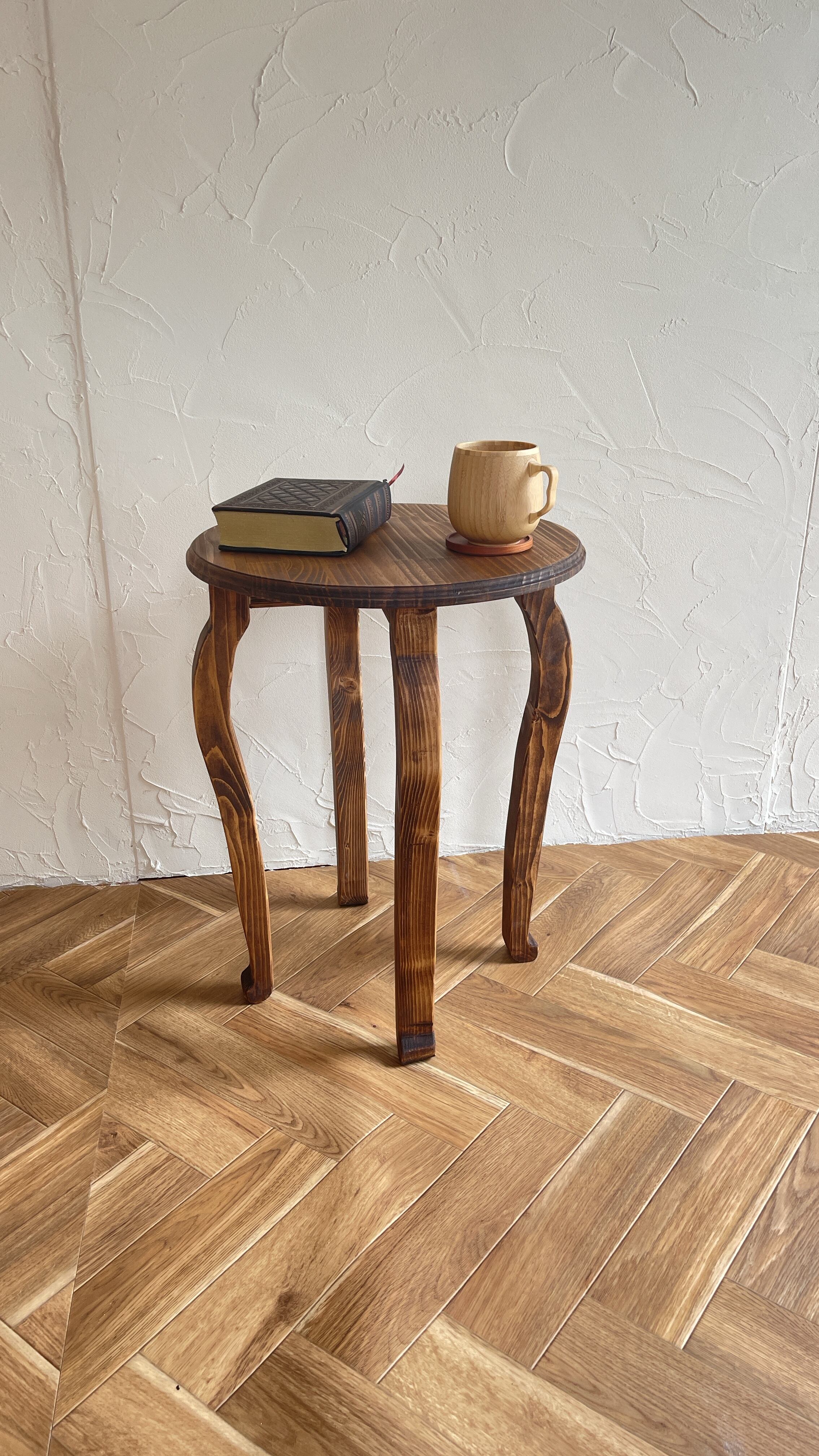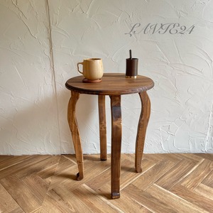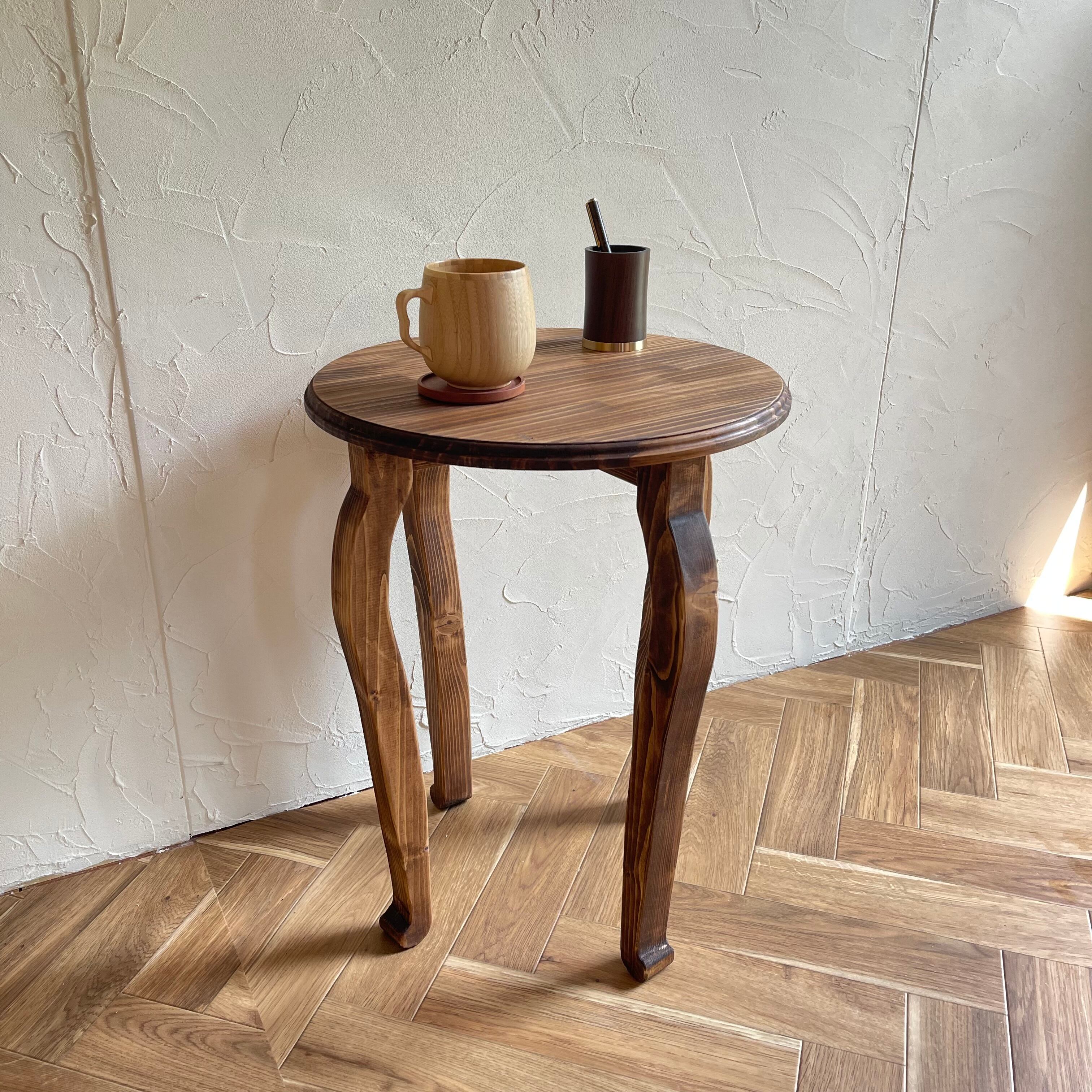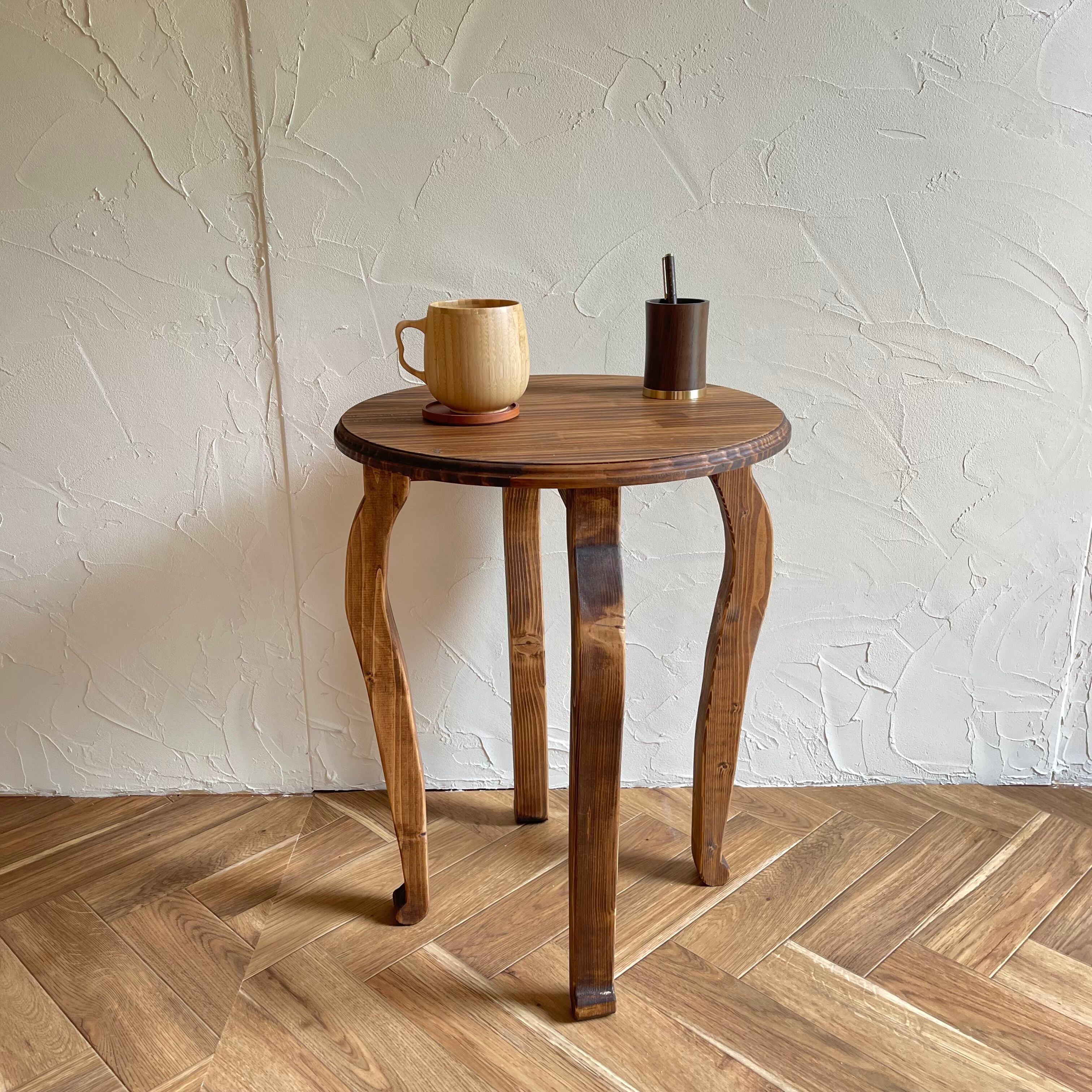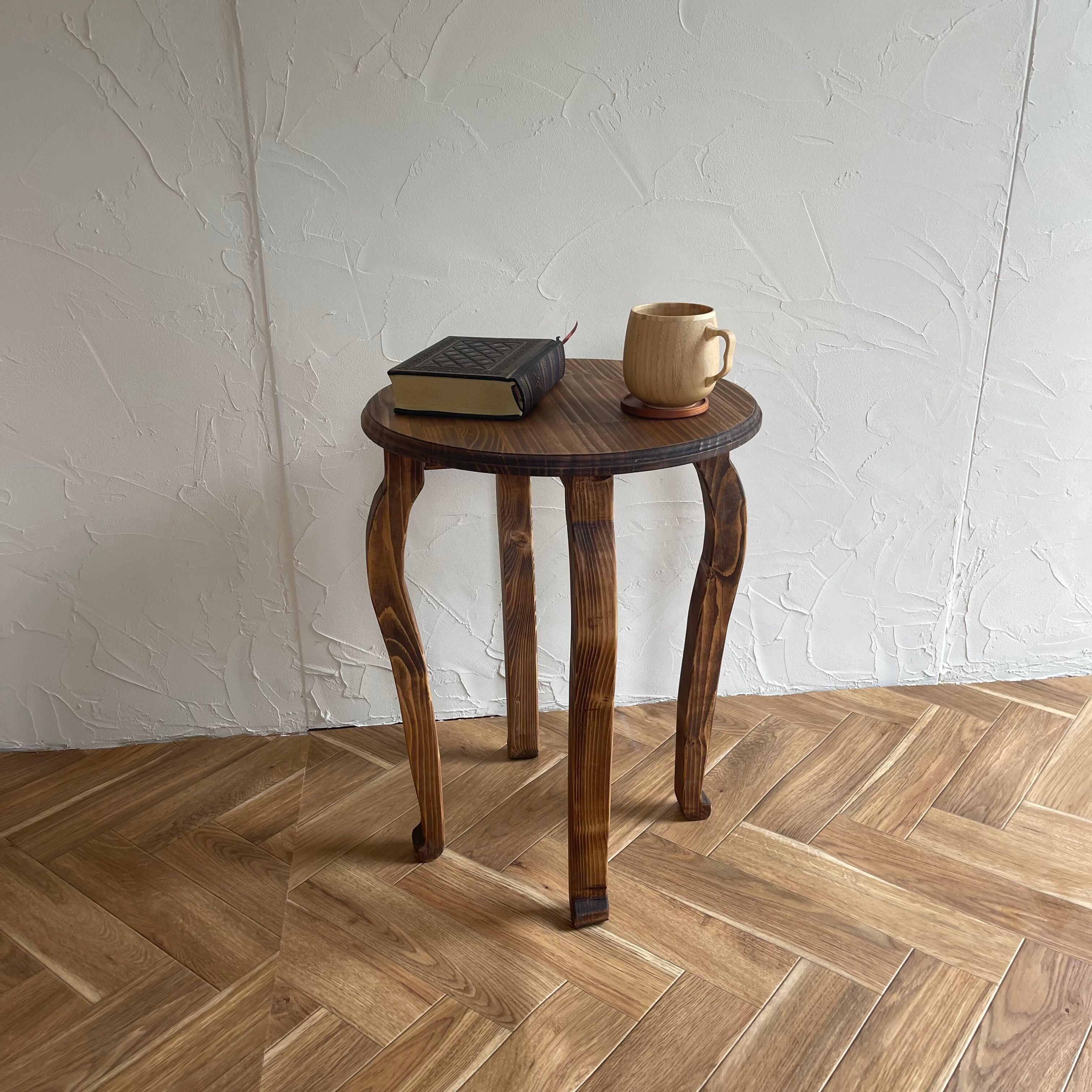 パイン集成材、天然無垢材を使用したアンティーク スツール、サイドテーブル。